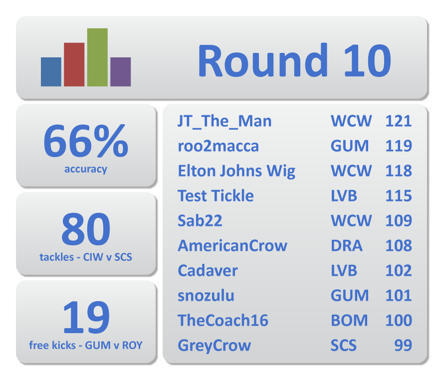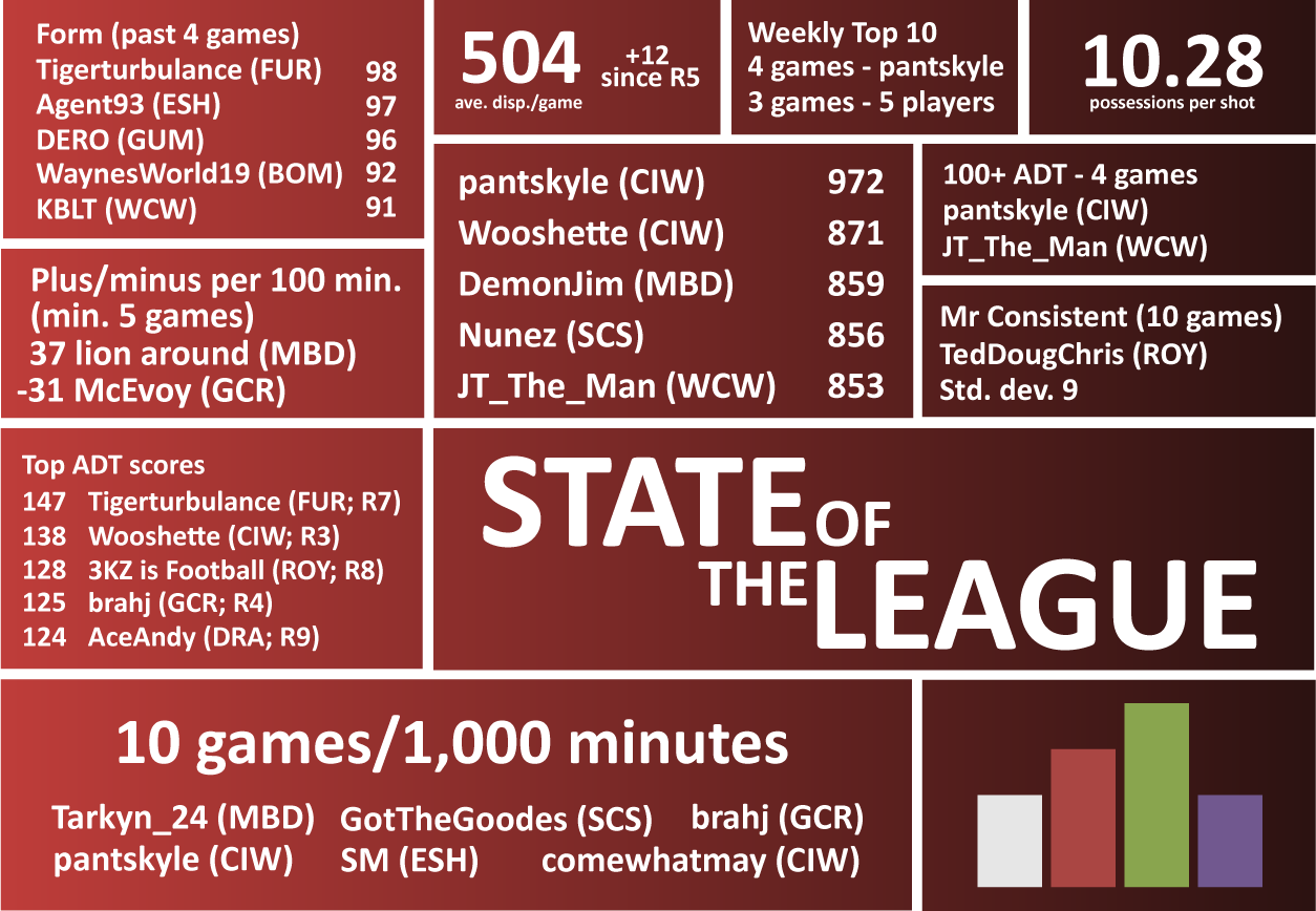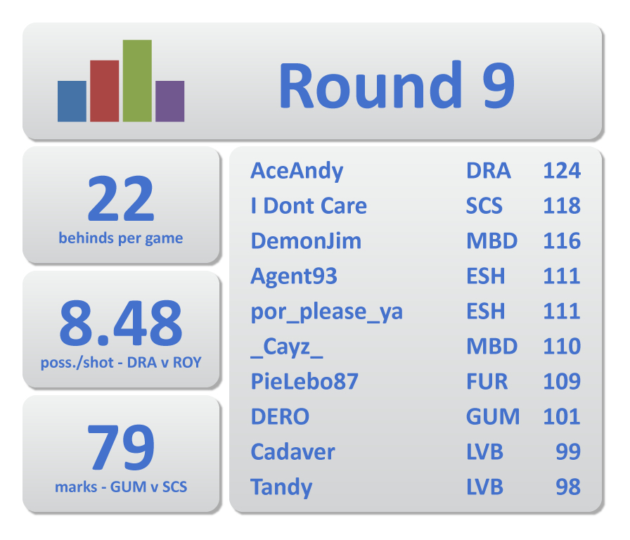 3KZ is Football achieves his first top ten finish of season 27 in style topping all players with 128 Adjusted Dream Team points from 33 disposals, seven marks and four tackles, in a 22-point loss to the East Side Hawks at home. Six Bombers cracked the ton this week with WaynesWorld19 leading the way with 117 ADT points. He was joined by WFL, Matty411 , crowmyzone, TheCoach16 and CALL ME SNAKE as the Bombers accounted for the Sin City Swamprats by 40 points. The whistles got a workout this week with a season high 38 free kicks awarded per game with a whopping 52 handed out in the Bombers v Swamprats game alone. The Demons and Dragons combined for a season high 335 kicks and 140 marks.